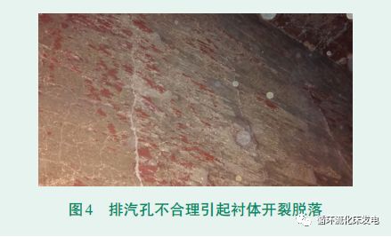 (4)刚施工完成的衬体内部含有水分。排汽孔设计不合理,锅炉启动后,衬体内水分不能很快脱离,引起可塑料浅层开裂、脱落(见图4)。