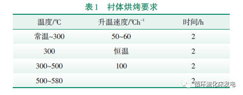 衬体施工完成后自然养护时间较短,只依靠自然烘干时间不够。在承受锅炉正常运行的高温条件之前通过烘烤对衬体进行干燥固化,使保温砖、衬体内的水分能够缓慢蒸发逸出,避免锅炉正常运行时衬体内水分急剧蒸发造成裂缝、凸起错位、脱离等情况,达到所需的强度和刚度要求,延长衬体的使用寿命。烘烤温度以旋风分离器进口温度测点为准,烘烤时严格按照温升速度进行加热,升温速度均匀,烘烤要求见表1。