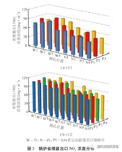 图2为U1和U2锅炉省煤器出口烟道截面上的NOx浓度分布。根据省煤器出口实际烟道尺寸,以孔间距1m、孔深度0.7m划分网格。在100%负荷SNCR喷枪系统正常投运的条件下,图3(a)中NOx浓度均值为71.4mg/m3,浓度分布相对标准偏差17.7%。图3(b)中NOx浓度均值为95.7mg/m3,浓度分布相对标准偏差11.1%。NOx浓度比在烟囱入口处测定值分别偏高2mg/m3和4mg/m3,这与NOx浓度分布均匀性和湿法脱硫喷淋洗涤烟气有关。两者均小于重点地区大气污染物特别排放限值100mg/m3,但是均远大于超低排放限值。若要进行超低排放脱硝改造,可增设烟道型SCR催化剂或O3脱硝装置等协同脱除NOx。前者主要缺点是需对省煤器出口与空预器入口烟道进行改造,烟气系统阻力增加约200Pa,若选用钒钛基催化剂,烟气中SO3浓度亦将增加约0.5%(SO2转化生成)。后者缺点是需要配置臭氧制造车间,运行电费较高。