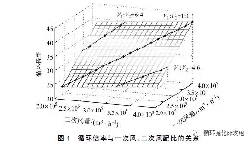 一次风量、二次风量比例(即一次风、二次风配比)是影响CFB锅炉循环倍率的另外一个主要因素.取3种不同的一次风量与二次风量比例(分别为1∶1、6∶4、4∶6),代入计算模型得到一次风、二次风配比与循环倍率的关系,如图4所示.