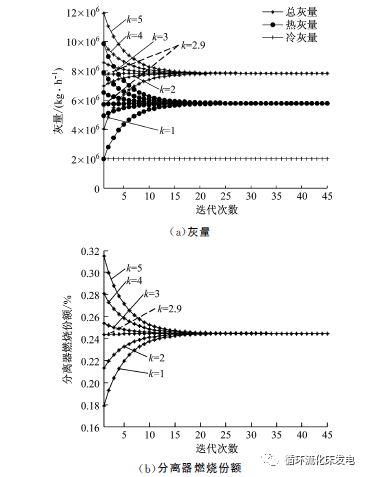 计算模型中热灰量与冷灰量之比k的初始取值决定着各参数的迭代过程,通常情况下,300MWCFB锅炉的热灰量比冷灰量多,即k≥1.分别取k=1、2、3、4、5,代入计算模型得到各参数迭代曲线,如图2所示.